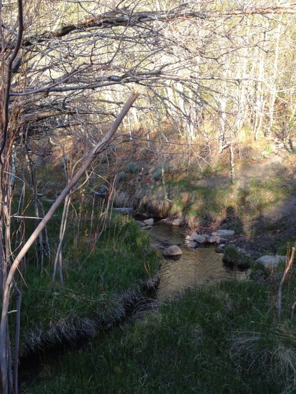 on a lovely little aspen-lined creek a few miles above Bishop. You can go even farther up either road and come to a lake, but this is a nice compromise, in the valley below the fork in the road. Save a few miles of driving straight up. Behind a big-ass moraine which cuts the valley in two.