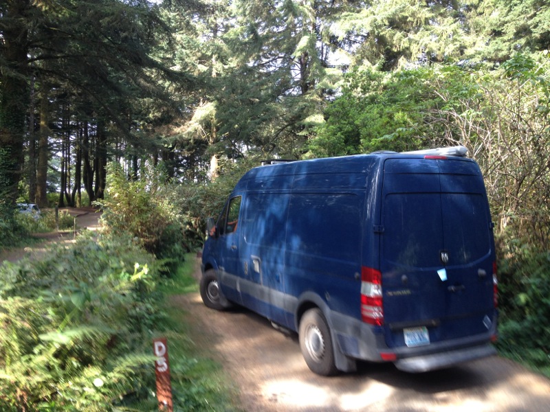 All along the coast I'm finding that August really is different from October. Not too many open sites left at 5:15! Also, a really long, "get out the crossword puzzle" wait at the gate for the dude in a Greyhound bus-sized camper to get his s--t together. This is why I am down on state campgrounds - the least pleasant and scenic spot of this trip for a third again as much money as the next most expensive. I am looking forward to that Oregon state provided shower tonight though...