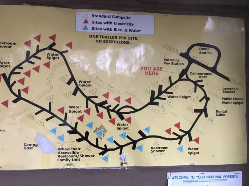 #5 is a open, level, no hookups site next to the creek - which I guess is Stony Fork. The have hot showers!