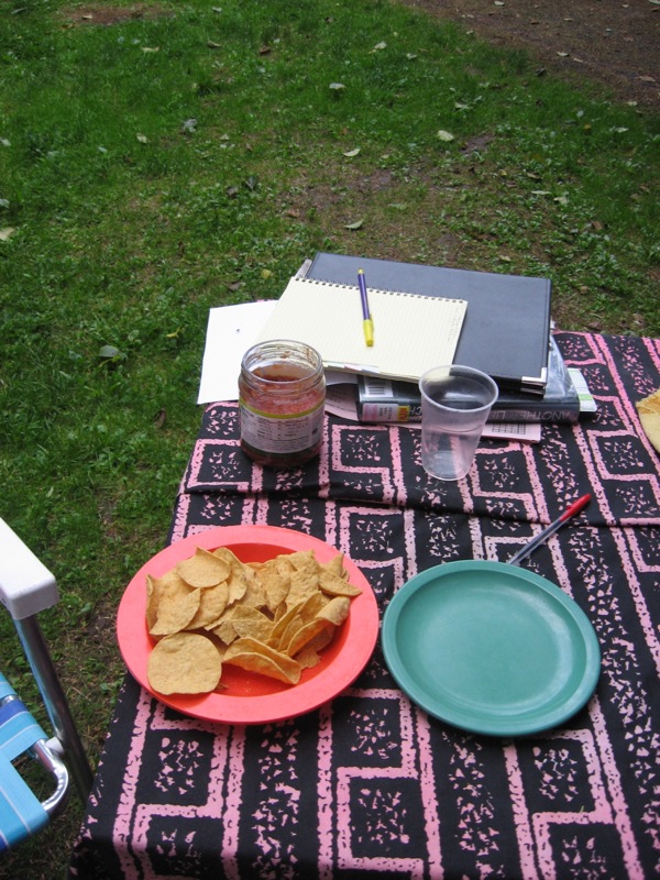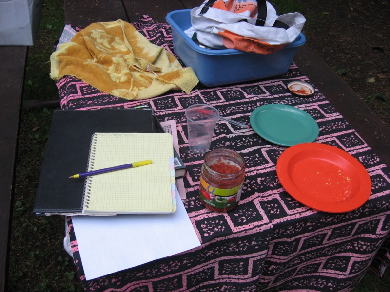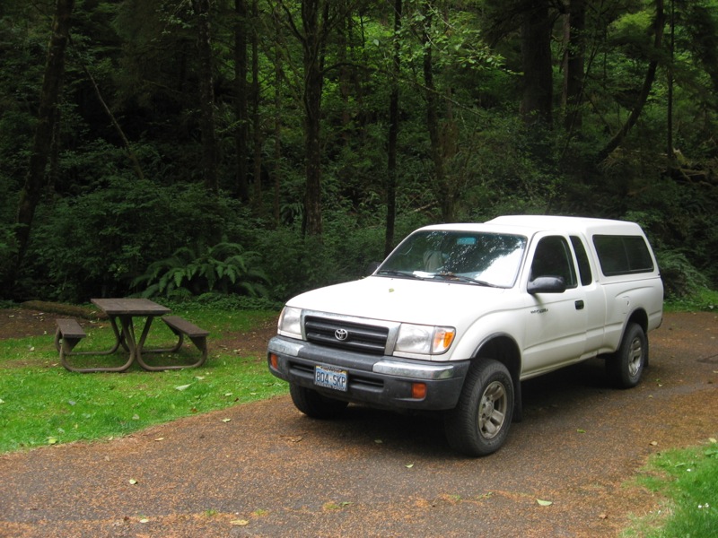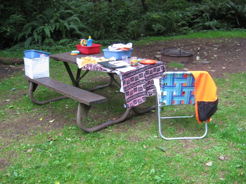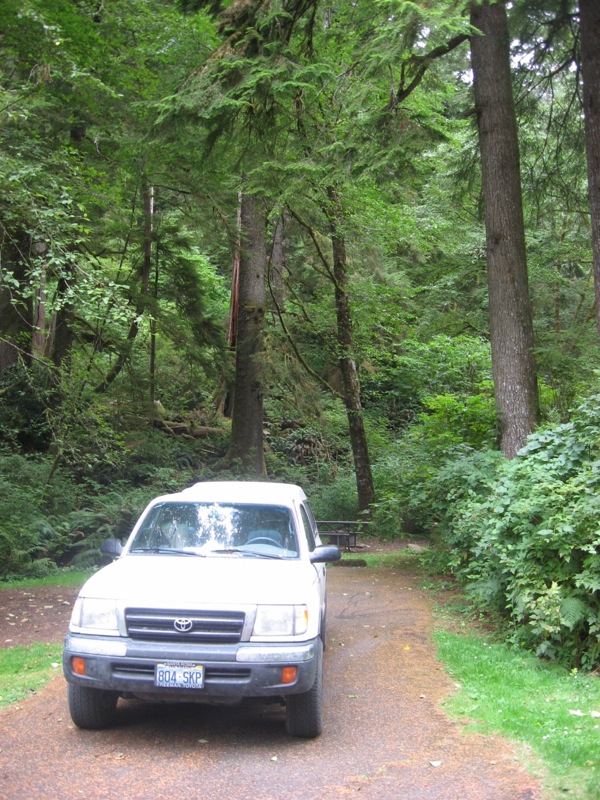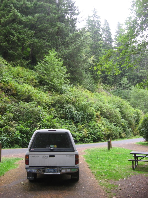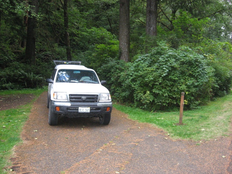 (*) Evidently most sites get two parking spaces. My bay had six spaces. The two pairs in the middle were for me and my neighbor, our picnic tables were 15 feet apart in this small grassy area. The two spaces on each end were for sites down the hill, through the underbrush, by the little creek.