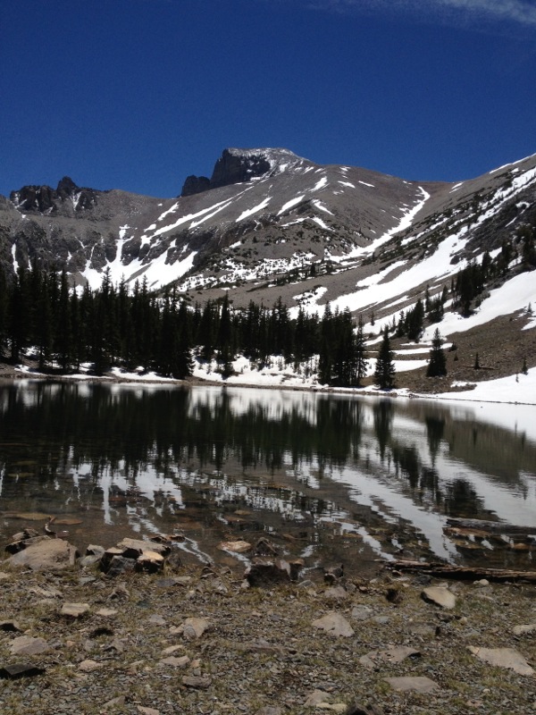 Good for me! I did something out of my comfort zone this morning! There is a loop hike up here, as close to the top of the world as I’m gonna get for a while. It’s not really very long – 2.7 miles, 600′ elevation change, two lakes and a ton of great views. I wimped out on doing it last time. I was so breathless just walking around the campground that it seemed the better part of valor not to. Also is was pretty late in the day. I did it this time, in the morning. I made coffee again, cleaned a few things out of the fridge, all in all had a pretty substantial meal. Then around 11 I headed on up. It was very fun. In addition to all the treats listed above, the snowmelt made quite a busy little seasonal stream tumbling through the pine forest. The hike kook a couple of hours, then it takes 45 minutes to get off the mountain, so it was about 3pm when I really left Great Basin. I think also that doing the hike after I have spent the night at that altitude let me acclimate somewhat.