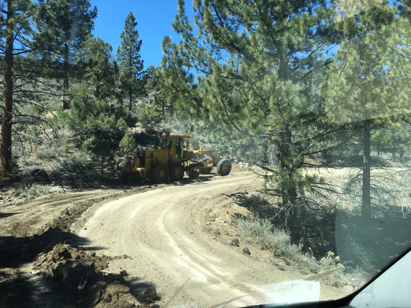 Backed up 30 yards to the start of the ridge and took the left. Followed this track for a mile or so: 6-8 turns on this narrow road. The turned-up dirt seemed extremely fresh. Then I went around another bend and boom! there’s a fucking road grader right in front of me, going about 2 mph, scraping out a nice clean corner on the hill side of the road and leaving the resulting dirt in the middle of the road, no doubt to take a second pass later and push it to the edge or over the edge.