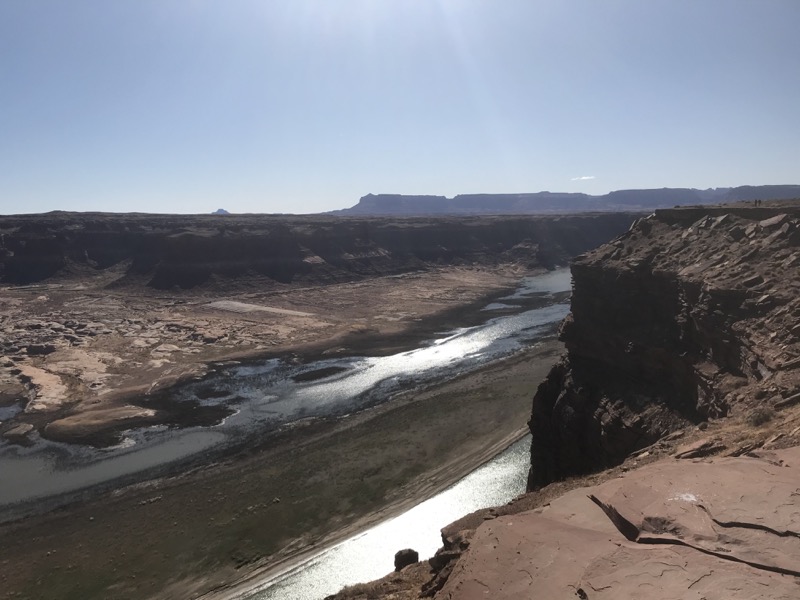 With THAT off my mind I can more or less enjoy this beautiful drive. The road descends to the level of the Colorado River at the very top of where it becomes Lake Powell, then ascends back up to the top of the slickrock the rest of the way to Hanksville. It’s a super interesting stretch of road. The road down with the turnoff to Hite, the spectacular Hite Crossing Bridge over the Colorado, then the equally cool bridge over the Dirty Devil River, then short drive at river/lake level where dispersed camping also happens. Back on top I pull off at the “must stop” Hite Overlook to soak up the amazing view of the sadly depleted lake, Hite, and the canyon.