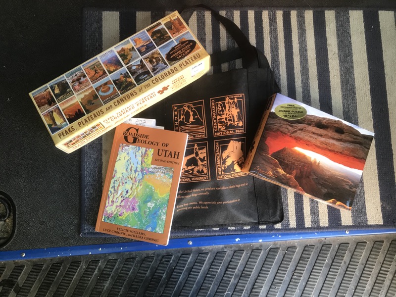 For whatever reason, today is the day when I finally bought Roadside Geology of Utah. I’ve checked it out of the library and brought it on a couple of trips, but really, I am enough of a geology geek that I should have my own. [stupid update: when I got home I realized I did this before, and now own TWO copies … sigh] I also randomly decided to buy a couple of jigsaw puzzles, and my total expenditure was just a bit over $60, so I randomly scored super cool Arches tote bag. I’m on a roll!
