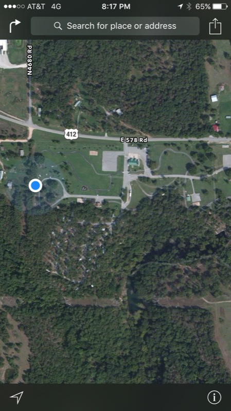 blue circle is the tent camping area, you can sorta see the RV camping in the trees below. The Dripping Springs are the dark area in the woods, lower middle right