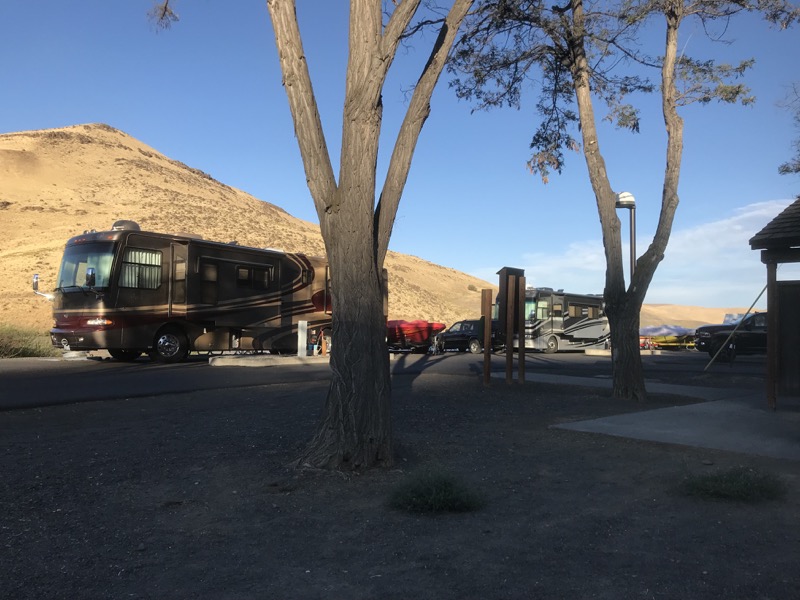 My campsite: the bathroom, Rv‘s, and bare hills across the river.