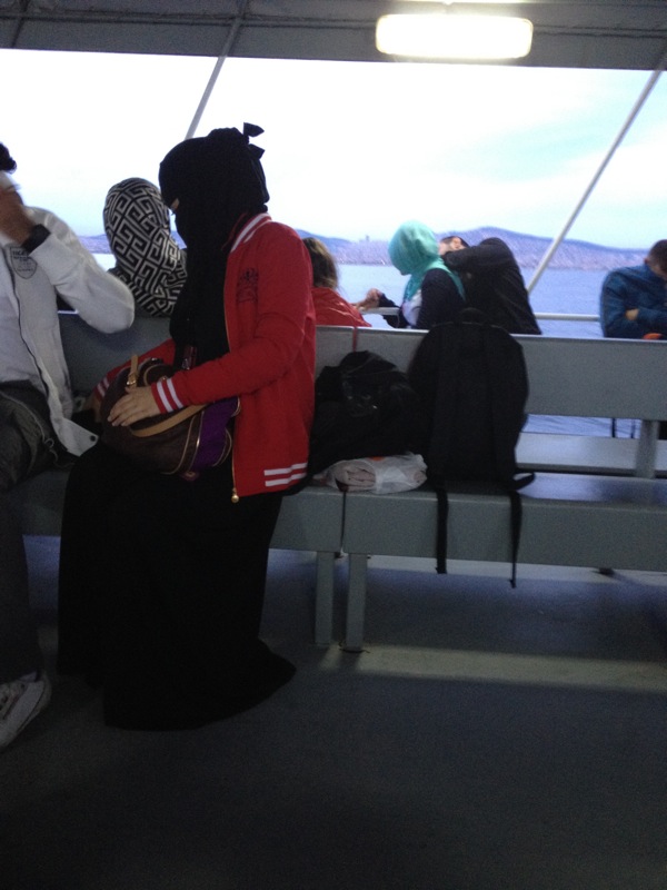 - Next we have the black coat, black scarf and covering everything but the eyes. There were a bunch of these ladies on the ferry. Again, some of these seem to be pretty stylish women under there. Their shoes could be just about anything – my favorite was blue low-top Chuck Taylors with white socks, most were expensive-looking low heels. When the ferry got chilly, the pile of black cloth across from me busted out a bright red varsity jacket over her black robes to stay warm. I can’t say I get the whole thing, if the point is to be modest in all black, what’s up with the bright red jacket?.