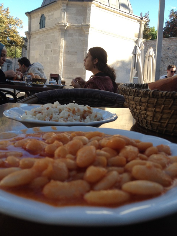 I am at the edge of Istanbul University – very busy and kids everywhere. The actual campus is under some kind of lockdown, one must show a picture id to get past the gate. Doesn’t much matter to me, I would’ve strolled through to see what it’s like, but the street is just fine. I find myself in a triangular plaza with a 30′ outside wall of the University on one side, Suleymaniye Mosque on another, and a little row of cafes on the third. Everybody was eating beans and rice. They looked mighty good I so settled in and ordered some. The were very good and satisfying and it turns out that it filled me so I didn’t need to eat any more that day!